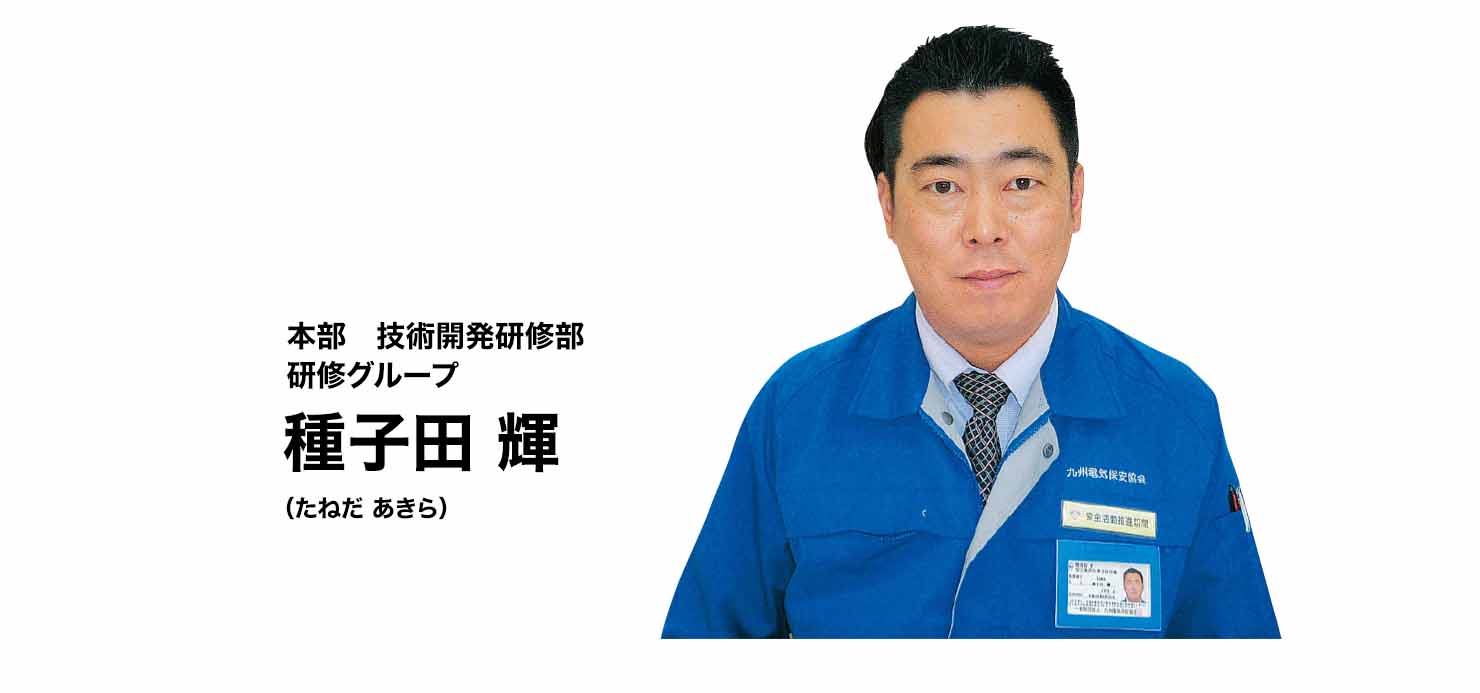 人財育成・職員研修を担当する部署で、総合技術研修センター(福岡市博多区)に4人が勤務しています。当センターには、座学をする大小5つの研修室と各種実習室、屋外に昇柱訓練の研修用電柱を設置しています。実習室には、各種高低圧受変電設備や一般家庭の点検を想定した模擬住宅、また内燃力発電設備や太陽光発電設備、消防設備点検の研修用設備があり、新入職員の技術研修から中級・上級職員の各種研修まで実施しています。