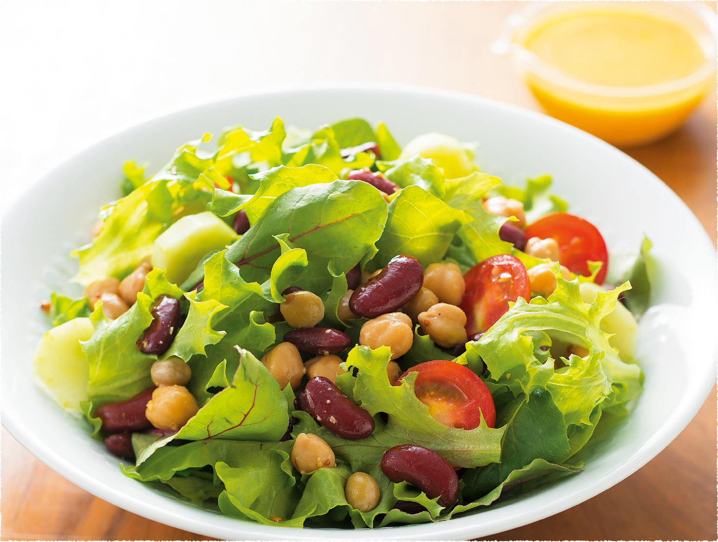 ❸器にベビーリーフと❷を盛り、上から豆のマリネを散らす。食べる前に❶のドレッシングをかける。