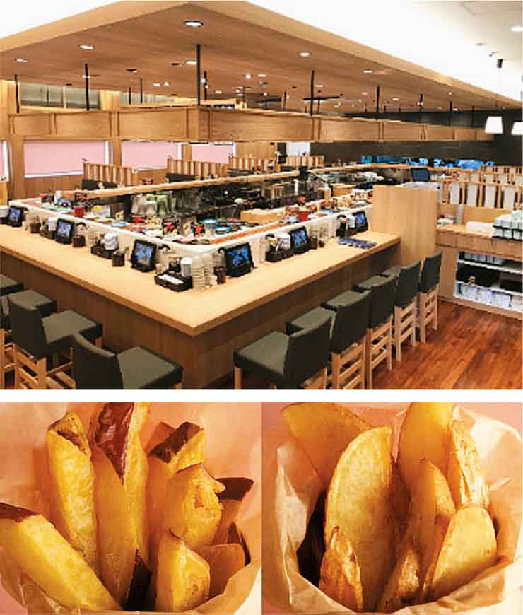串間の食文化を楽しめるのは飲食物産館。「ウミヤマショクドウ」では串間が誇るブランド魚“黒瀬ぶり”をメインに押し出したメニューが並びます。「年間を通して安定供給できる養殖の強みを活かし、いつでも新鮮なぶりを食べられます」と藤井さん。他にもテナントとして地元の回転寿司店、串間のブランド甘藷“やまだいかんしょ”を使ったスイートポテトフライのテイクアウト店もあります。物産コーナー「ウミヤママルシェ」では、串間産の旬な農水産物を直売。約100軒の生産者が登録しています。「お客様の笑顔や喜びを励みに出荷してもらっています」と藤井さん。皆で相談して栽培時期を変えたり、売り方を工夫したり。またオリジナルブランド「串間屋」を立ち上げて加工品を開発するなど、生産者と道の駅くしまはお互いに“作り甲斐がある”いい関係を築いているそうです。
