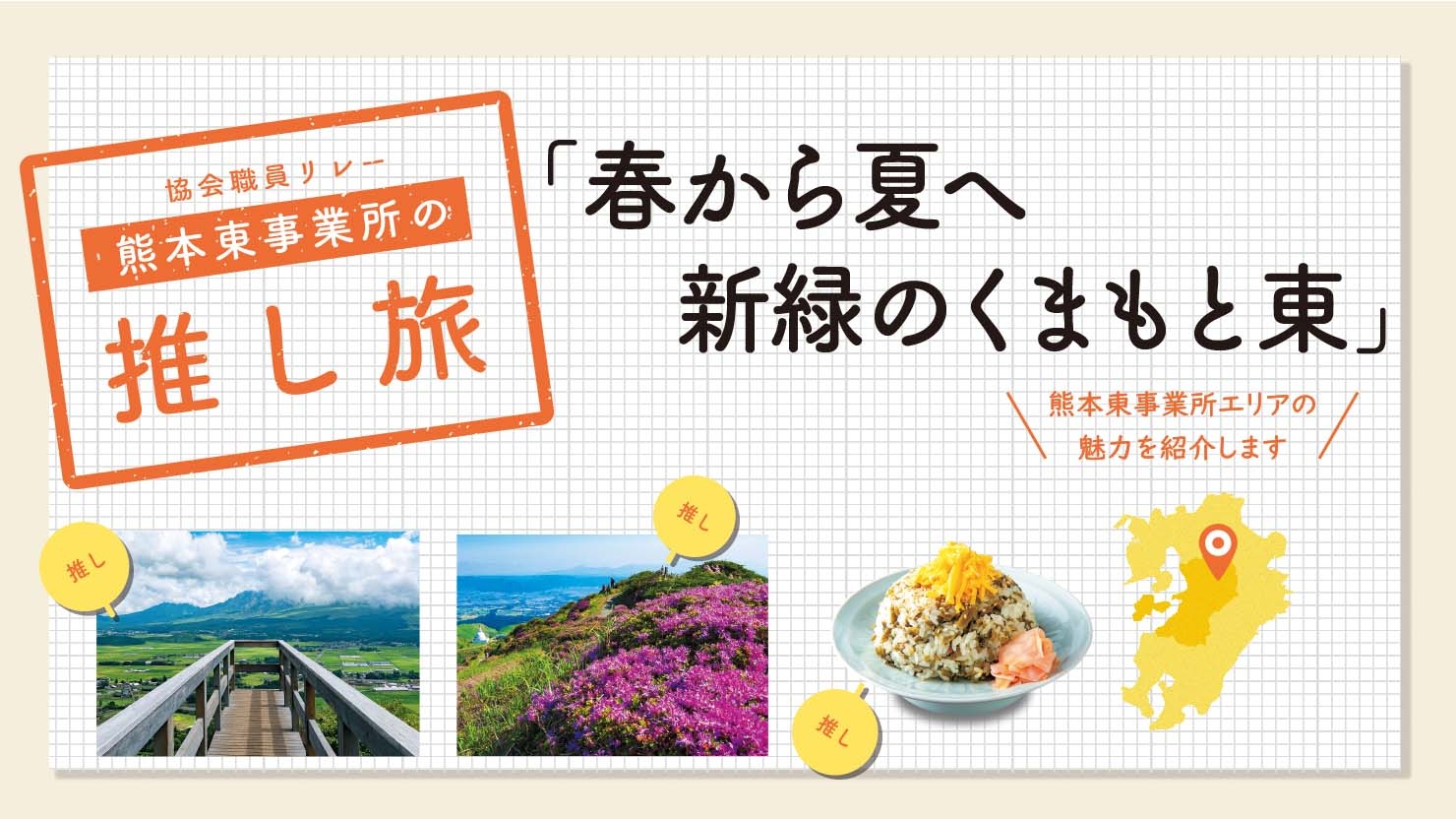 熊本県北東部などをエリアとする熊本東事業所がおすすめするのは、9万年前の大噴火によって形成された阿蘇の素晴らしい大自然の数々です。