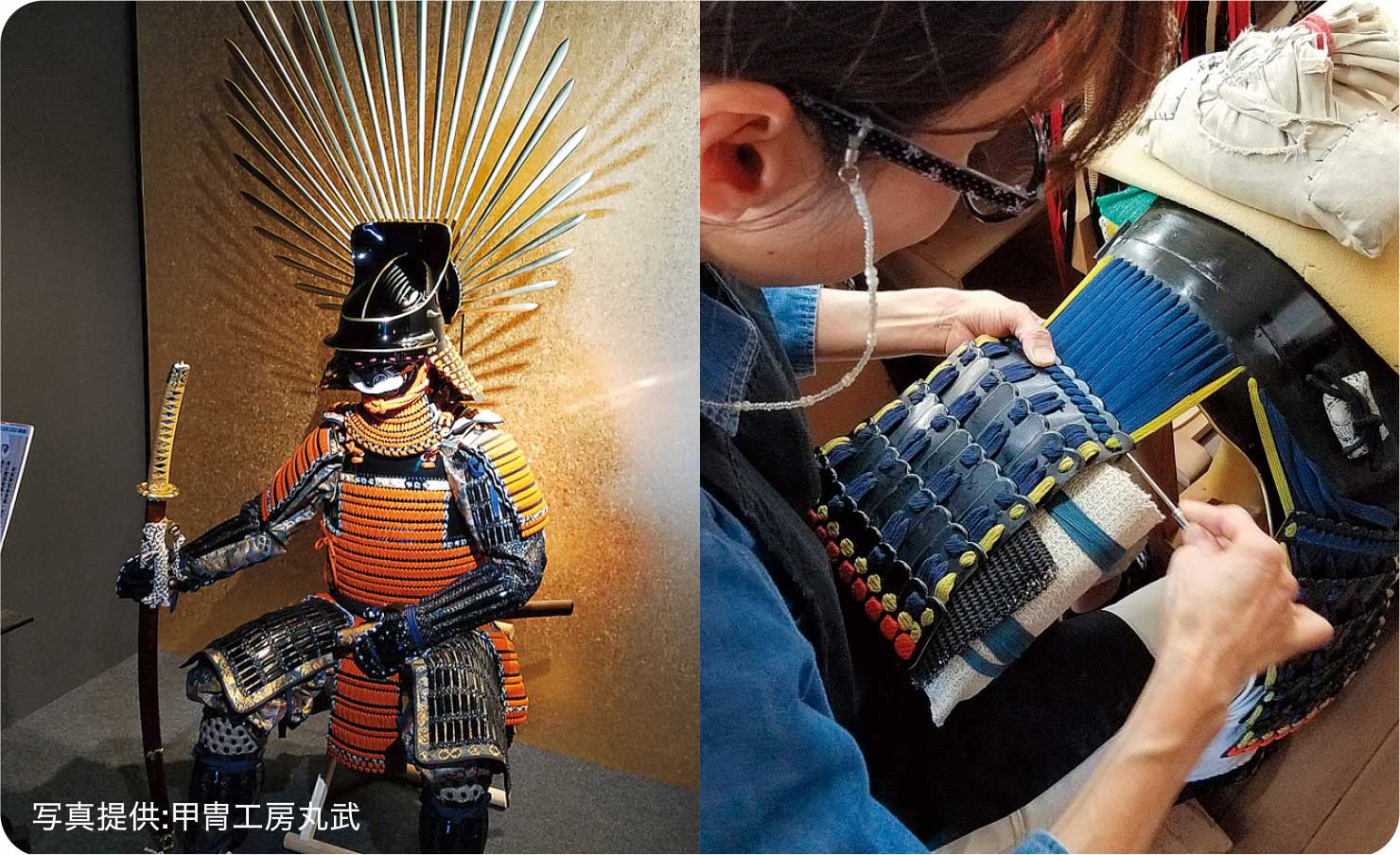 時代劇で使われる甲冑を製作している「甲冑工房丸武」。敷地内では甲冑製作の工房での作業の様子を見学できたり、戦国武将の甲冑や時代劇で使用された甲冑のレプリカを展示していたりと戦国時代ファンなら見逃せない人気スポットです。甲冑の着付け体験ができ、射的場、お食事処、戦国武将グッズのお土産処もあります。